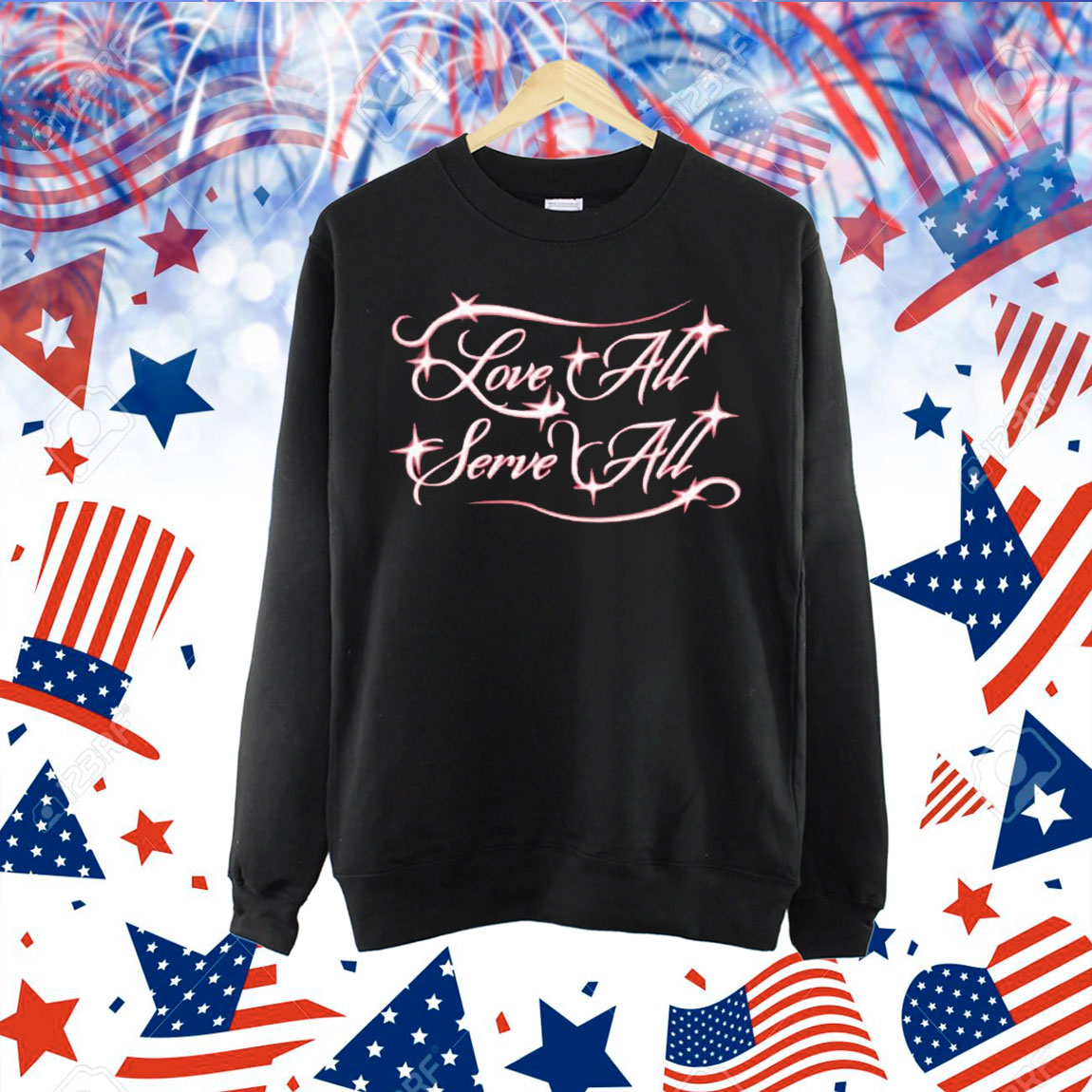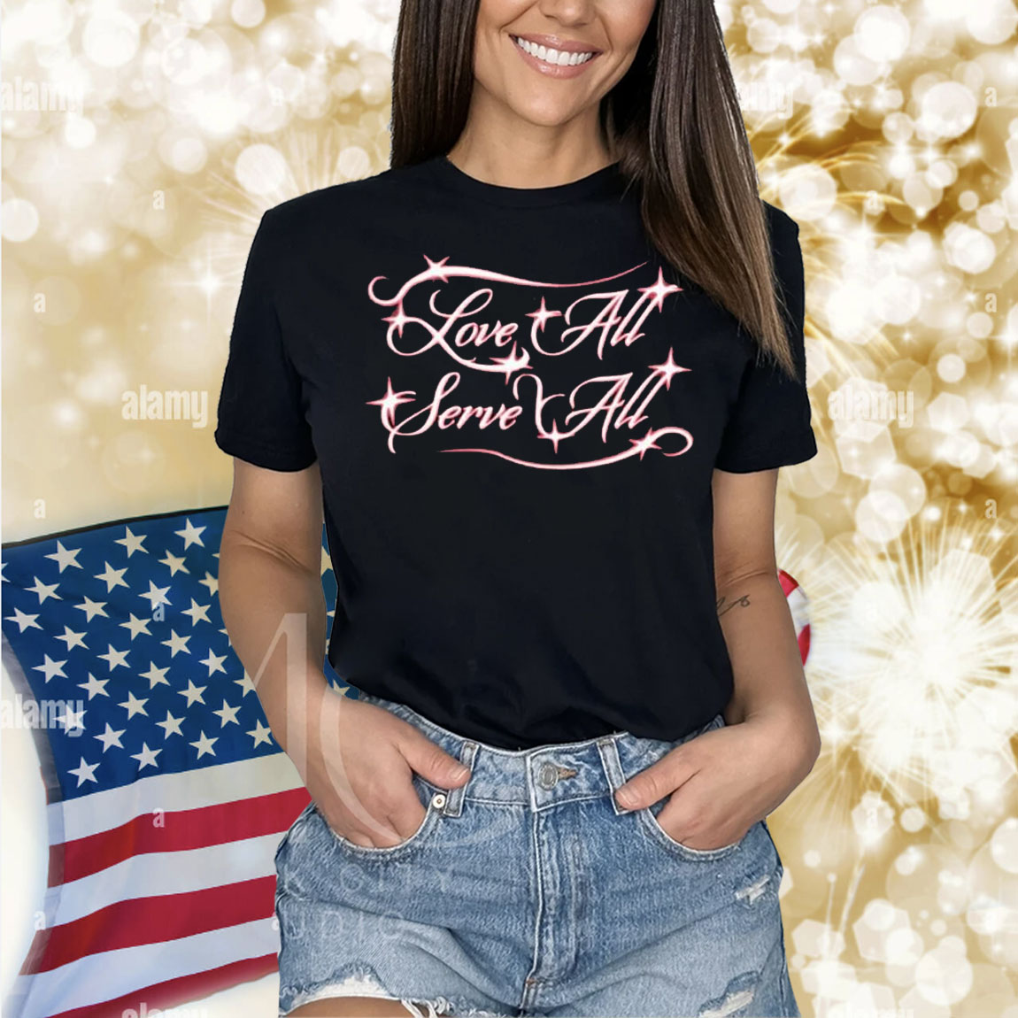 The shirt features a unique design with the words “Love All Serve All” boldly printed on the front, making a powerful statement about spreading love and kindness to all. The classic black color makes it versatile and easy to pair with any outfit, whether you’re dressing up for a night out or keeping it casual for a day at the beach.